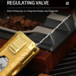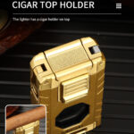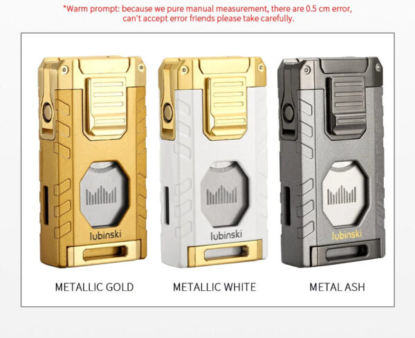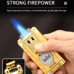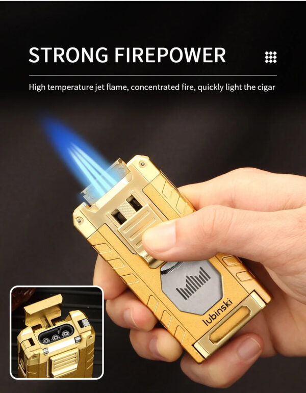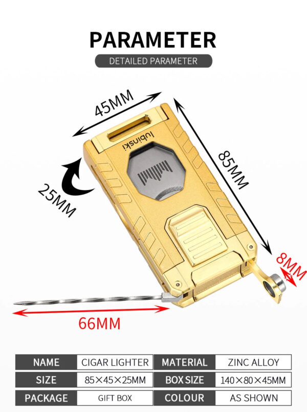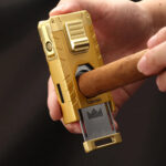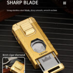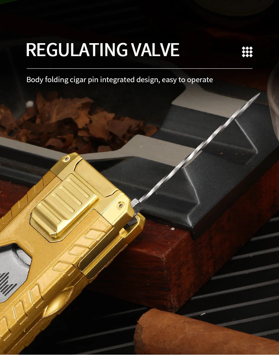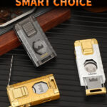 Crafted from durable metal, this all-in-one tool features a powerful, adjustable triple-flame jet lighter with a visible fuel tank. It includes both guillotine and bullet cutters, plus a cigar needle, and even a top cigar cradle. Available in 4 stylish colors and presented in a beautiful gift box, it’s the perfect companion for any cigar aficionado.