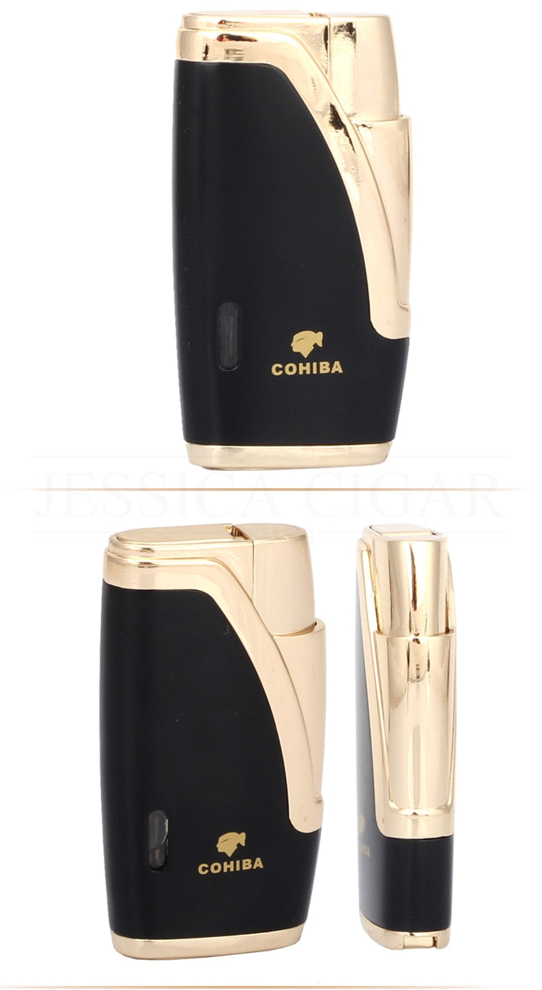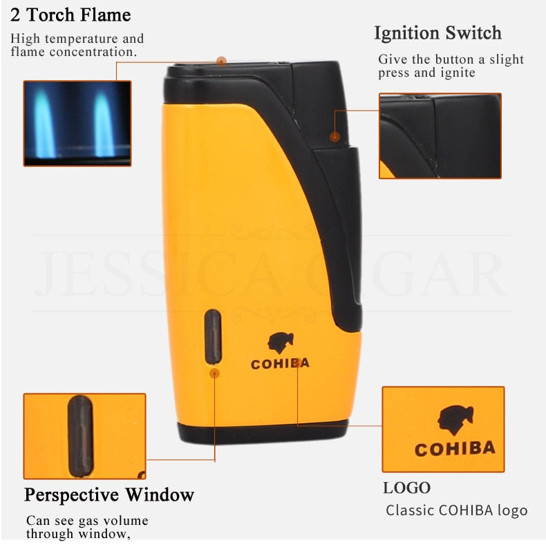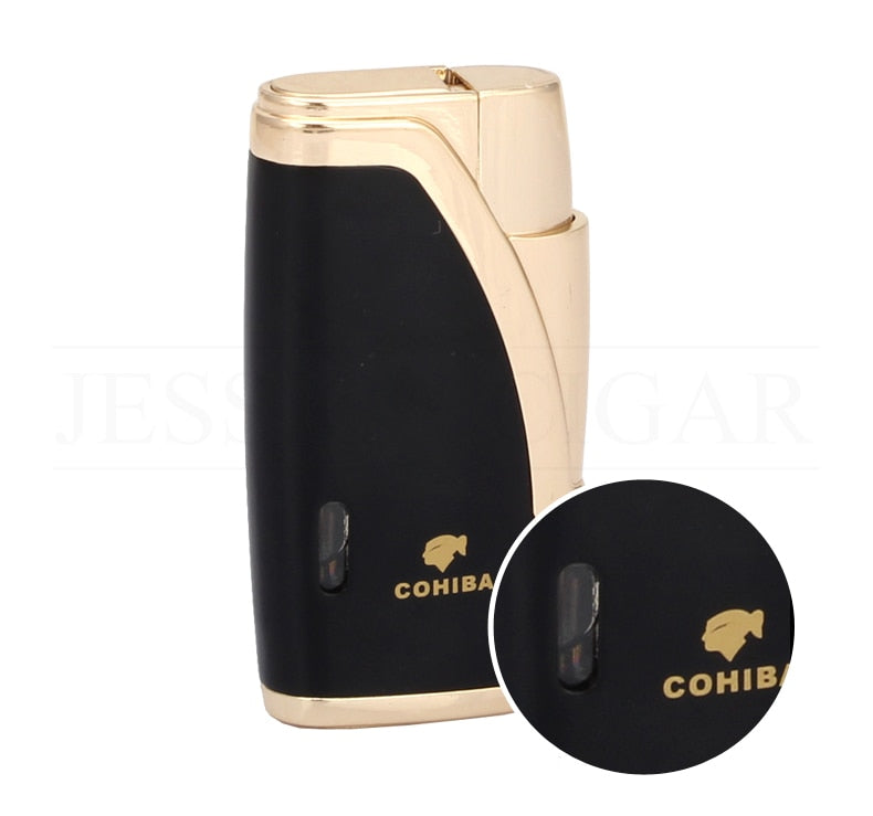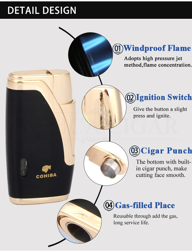 COHIBA CIGAR LIGHTER – 2 TORCH JET FLAME REFILLABLE WINDPROOF LIGHTER W/ CUTTER PUNCH & GIFT BOX